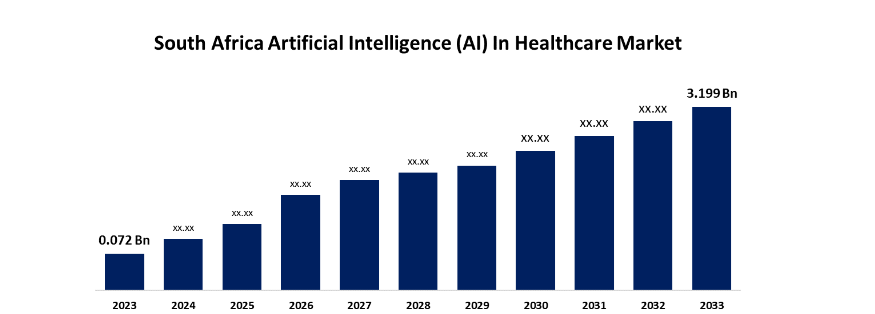 As per Spherical Insights reports, the AI in healthcare market in South Africa was USD 0.072 billion in 2023 and is expected to reach USD 3.199 billion by 2033. The graph below will illustrate the projected growth of AI in South African healthcare over the next decade: